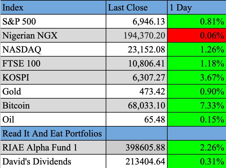 Markets as of 25th February 2026. Cells in RED mean that the value is down, cells in Green mean the value is up.